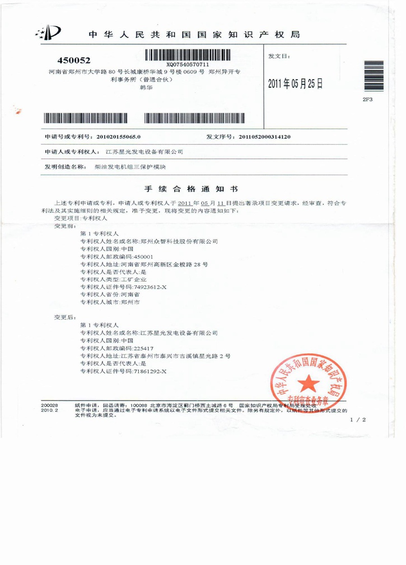 柴油發(fā)電機(jī)組三保護(hù)模塊-專利證書