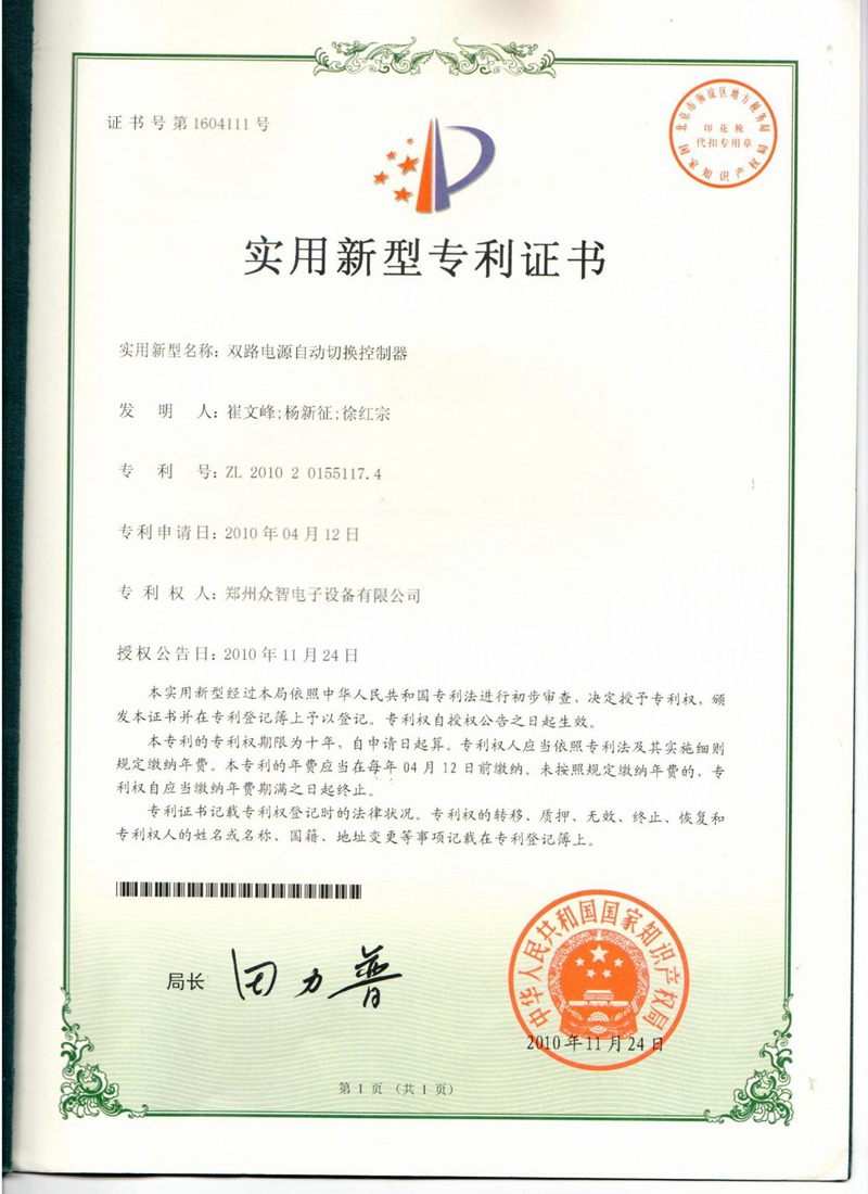雙路電源自動切換控制器-專利證書