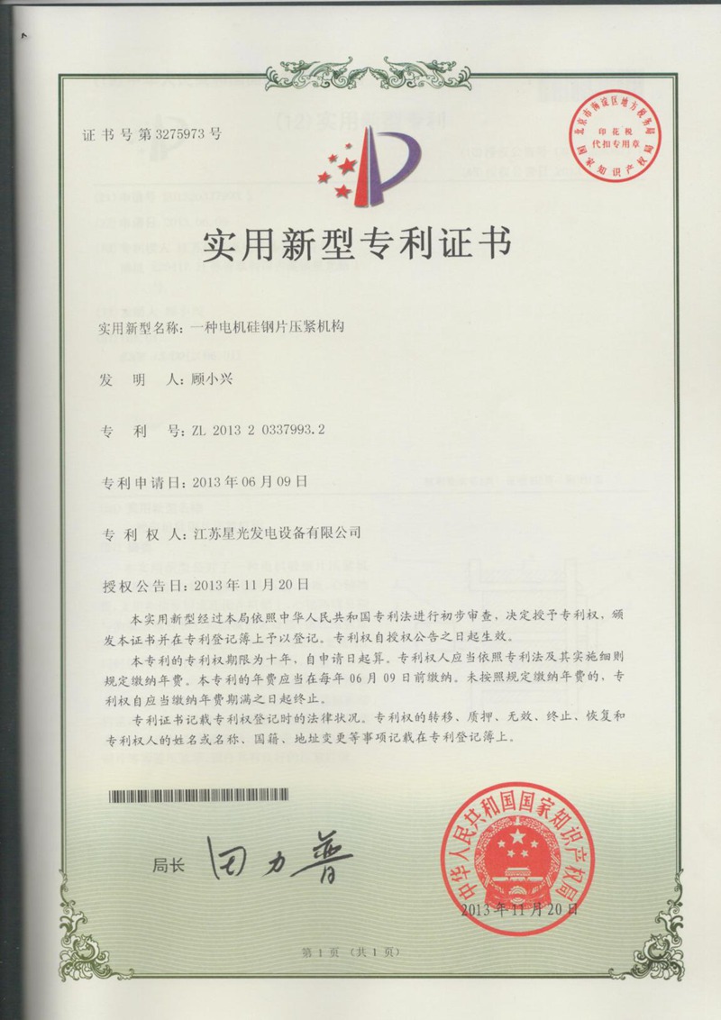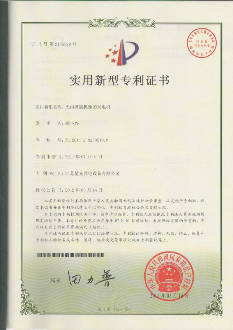 無內(nèi)撐筋機(jī)座的發(fā)電機(jī)-專利證書